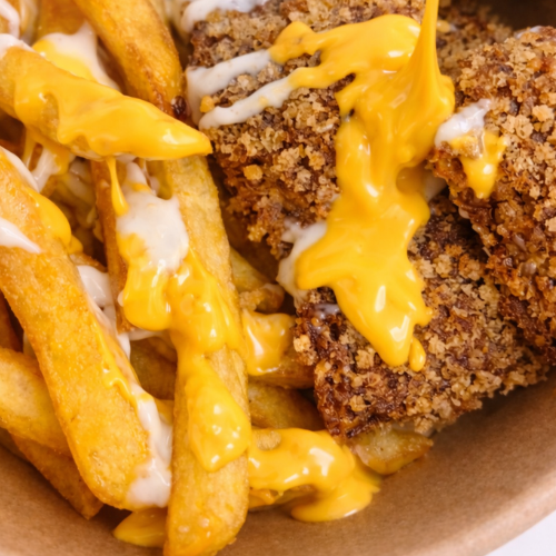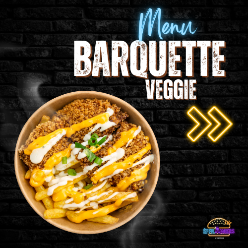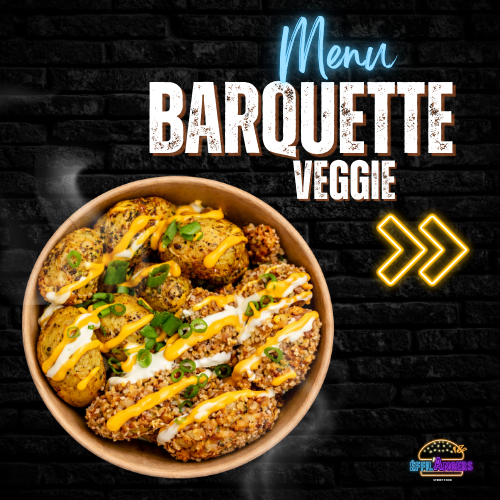 Galette de quinoa et légumes de saison, Sauce cheddar + Pommes de Terre Grenaille